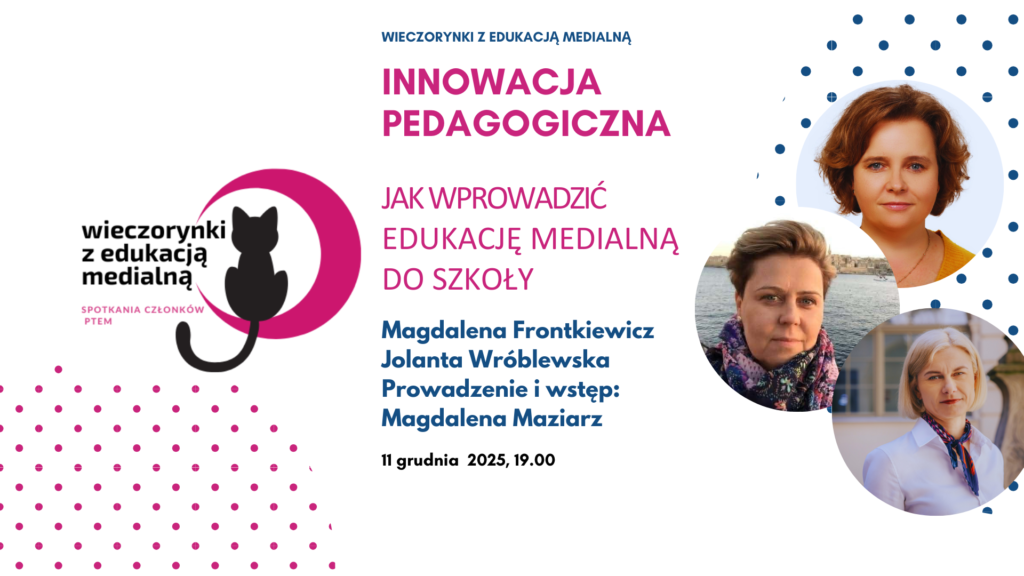 11 grudnia 2025 r. spotkaliśmy się, aby rozmawiać o szkolnej edukacji medialnej. Magdalena Frontkiewicz i Jolanta Wróblewska – nauczycielki ze szkół średnich – opowiedziały o programach innowacji pedagogicznych realizowanych od lat w szkołach, w których pracują.